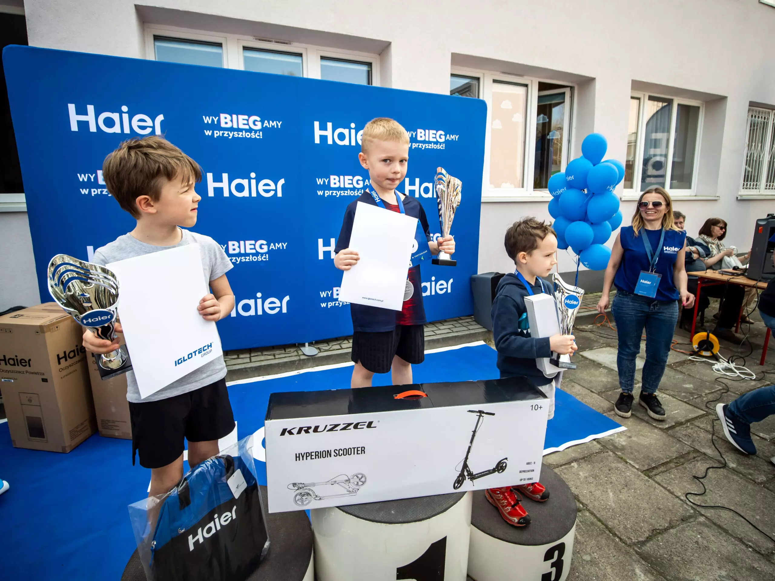 Każdy uczestnik biegu Haier Run 2023 – WyBIEGamy w przyszłość otrzymał pamiątkowy medal we wszystkich kategoriach wiekowych oraz dystansowych. Zwycięzcy zostali nagrodzeni atrakcyjnymi nagrodami, wśród, których znalazły się między innymi hulajnogi, deskorolki, słuchawki oraz sprzęt sportowy. Zacięta rywalizacja zdominowała bieg w kategorii open, ponieważ nagrodą główną biegu Haier Run 2023 był zaawansowany technologicznie oczyszczacz powietrza Haier PURE Comfort, który gwarantuje najskuteczniejsze oczyszczenie powietrza potwierdzone wskaźnikiem CADR 500 m³/h. Dodatkowo, poza uczestnikami biegu nagrodzono uczennicę SP nr 142 – Kasię, która zwyciężyła w konkursie na niepowtarzalną nazwę biegu oddającą charakter marki Haier. Kasia z nieskrywaną satysfakcją odebrała podczas imprezy rower górski.