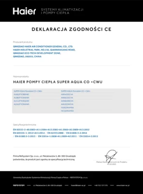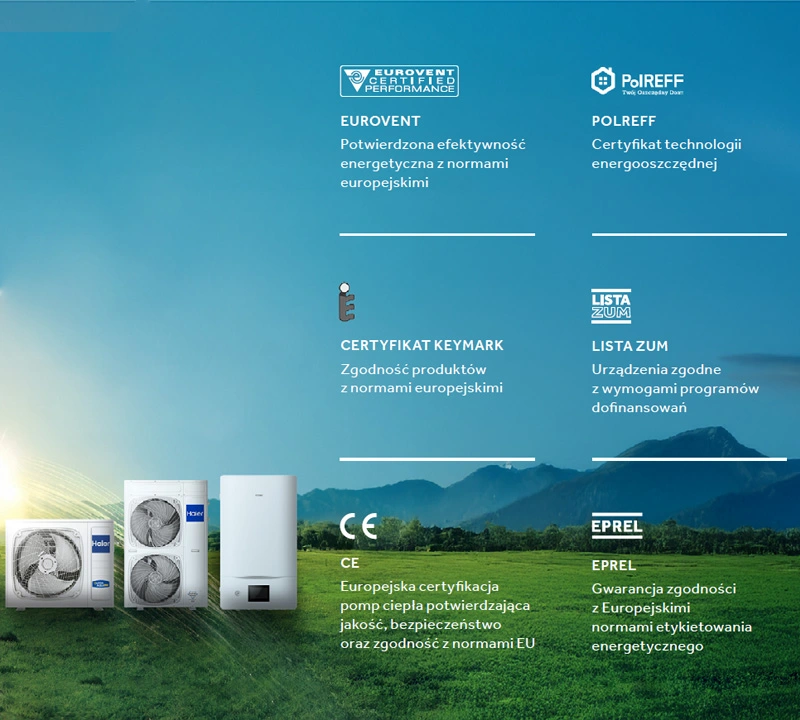 Pompy ciepła SUPER AQUA Haier to sprawdzone urządzenia, których jakość i niezawodność została potwierdzona niezależnymi certyfikatami. Pompy ciepła Haier posiadają europejską certyfikację EUROVENT, potwierdzającą jakość urządzeń. Ważnym potwierdzeniem jest również PolREFF, czyli certyfikat określający poziom energooszczędności. Dzięki certyfikatom PolREFF pompy ciepła kwalifikują się do Ulgi Termomodernizacyjnej. Kolejną certyfikacją jest KEYMARK, świadcząca o zgodności produktu z normami europejskimi dotyczącymi zdrowia, bezpieczeństwa i środowiska. Dodatkowo urządzenia Haier posiadają certyfikat CE i wpis w europejskiej bazie EPREL, są na Liście ZUM i spełniają standardy środowiskowe programu Czyste Powietrze.