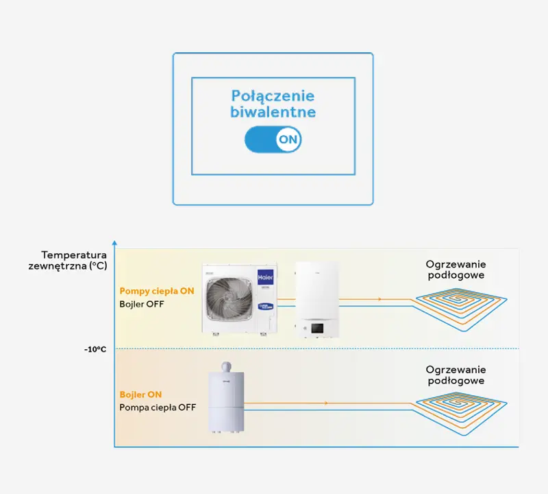 W systemie biwalentnym pompa ciepła pracuje razem z drugim niezależnym źródłem ciepła, np. piecem grzewczym. Ustawienie takiego połączenia jest możliwe z poziomu sterownika i w takim przypadku pompa ciepła automatycznie kontroluje pracę dodatkowego urządzenia – bojlera. Punkt biwalencyjny jest graniczną temperaturą, w której pompa ciepła ciepła pracuje samodzielnie. Poniżej temperatury tego punktu pompa ciepła automatycznie wspiera się pracą bojlera w celu podgrzewania CWU.