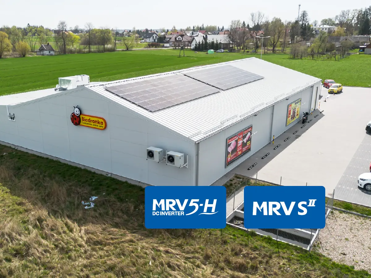 Instalacja w Biedronce w Juchnowcu Kościelnym składa się z czterech agregatów MRV S-II oraz jednostek wewnętrznych CASSETTE. System pracuje całorocznie, utrzymując komfortową temperaturę w budynku i stabilną efektywność energetyczną.